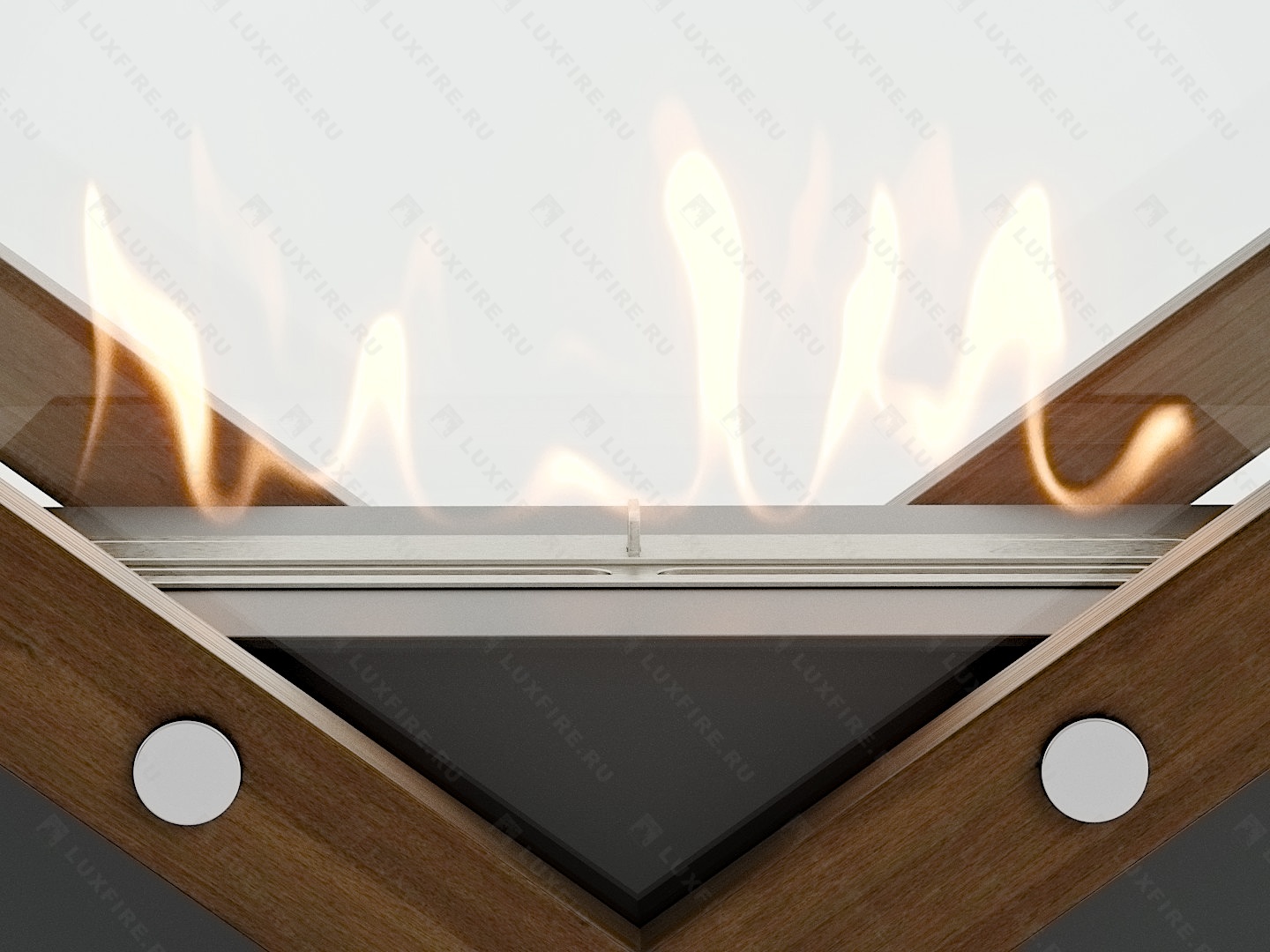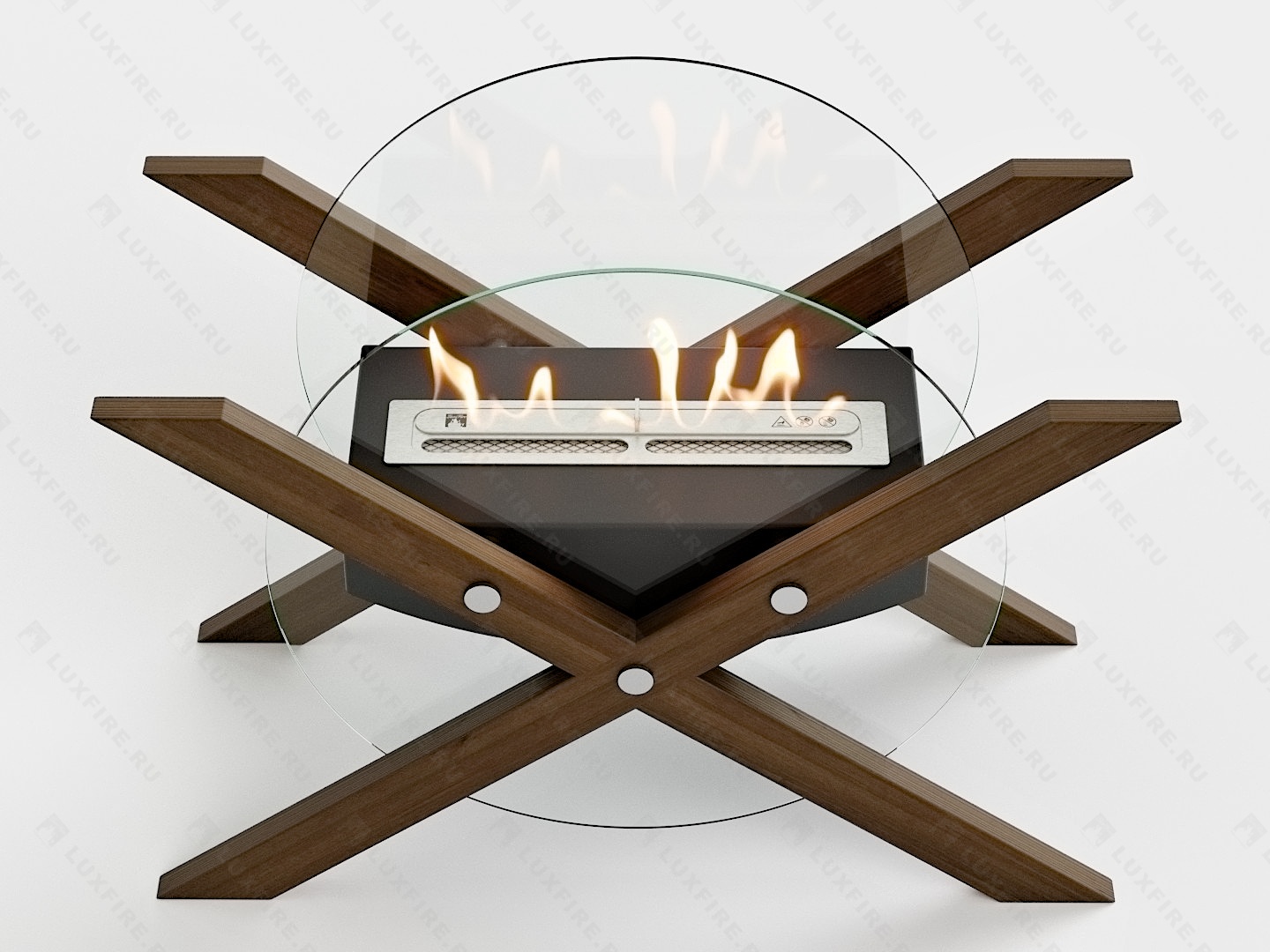 Представляет собой сборную модель оригинального авторского дизайна студии "Vontaren&Grinero" из закаленного стекла и топливного блока Luxfire 350 XS на подиуме, закрепленного на 4 дистанционных держателях. С деревянными натуральными накладками и обработанных огнебиозащитным средством.