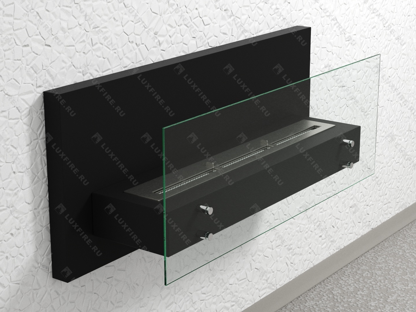 Представляет собой сборный металлический каркас с топливным блоком Lux Fire 900 М, закрепленный на 4 дистанционных держателях к защитному стеклу с подвесом к стене.