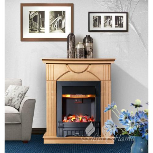Изготовлен портал каминокомплекта с использованием современного материала МДФ, который характеризуется волокнистой структурой, схожей с натуральной древесиной. Это позволяет украсить его резьбой без нарушения целостности структуры. Важным преимуществом МДФ перед натуральной древесиной является более высокая устойчивость к перепадам температуры и влажности. Дополнительную защиту обеспечивает слой натурального шпона. Он также выполняет и декоративную функцию, имитируя цвет и фактуру светлого дуба. В сочетании с черным цветом очага такой камин выглядит уместно практически в любом классическом интерьере.