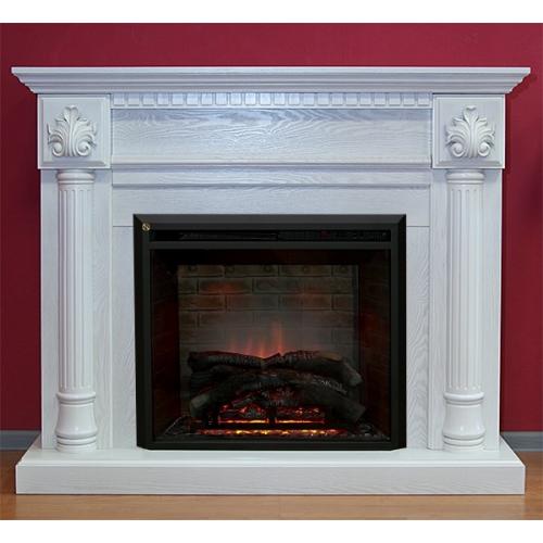Основание электрического камина в сборе с порталом исполнено из металла - электрокамин и МДФ - портал. В комплекте идет пульт для дистанционного управления. Кроме этого, именно в этой модели есть специальный режим для регулировки яркости пламени и топки. Цвет очага - черный, в комплекте идет муляж прогоревших дров, а также термостат. Есть две ступени нагрева, декоративный режим, а также обогрев.