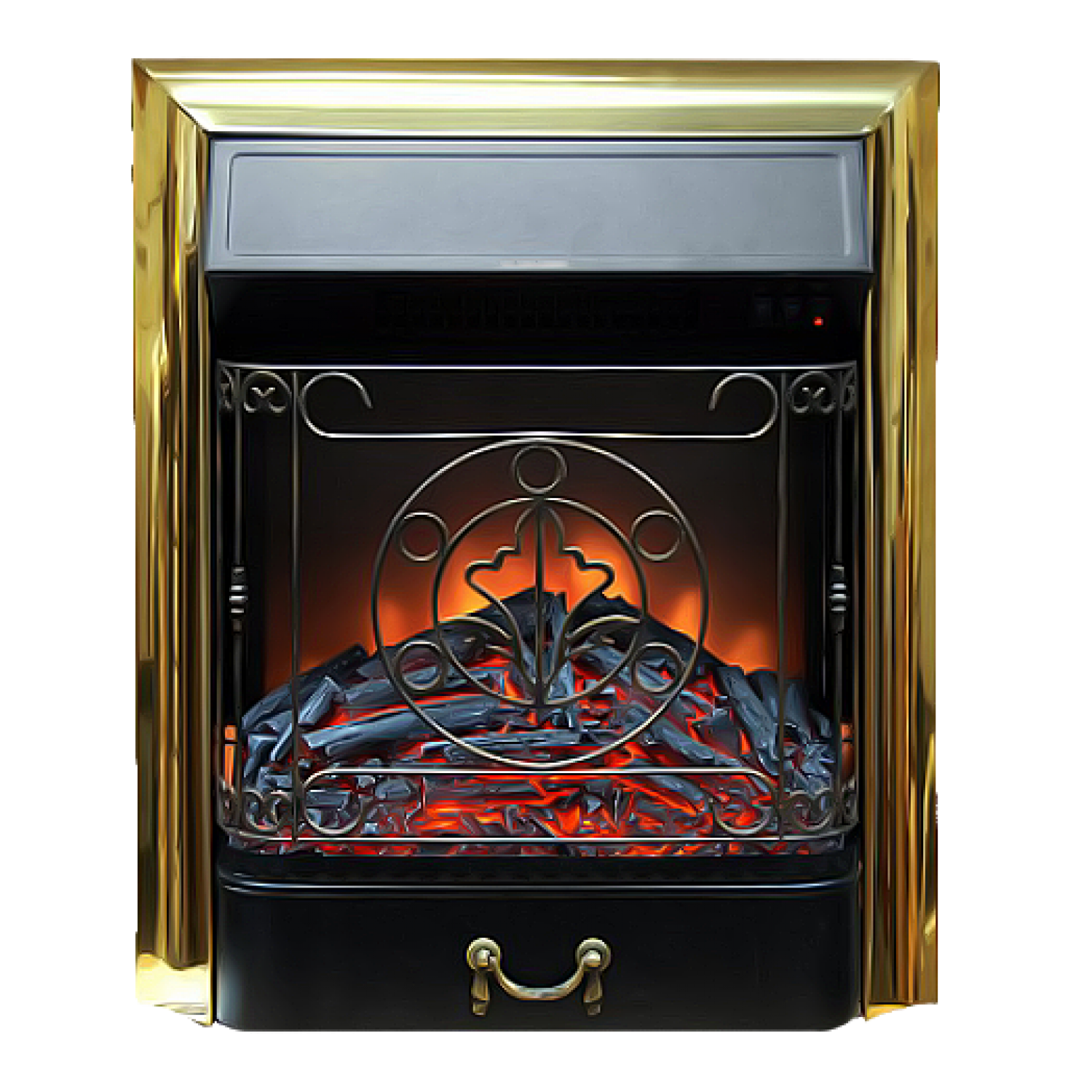 Электротопка в золотой раме смотрится дорого и роскошно. Как и у всех классических английских каминов, конструкция топочного окна модели имеет вытянутую по высоте форму. Узкая ширина придает камину изящности и изысканности. Вместо защитного стекла, очаг закрывает стилизованная под старину решетка. Для ее изготовления используется стальная проволока круглого сечения. Витиеватый орнамент в центре композиции напоминает фамильный герб. По нижнему краю топки расположен декоративный зольник с золотистой ручкой, а вверху есть модуль, в котором скрывается электронный блок управления. Конструкция продумана и очень удобна в использовании.