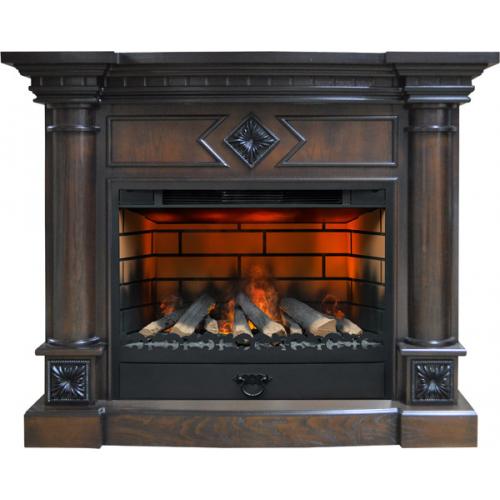 Портал каминокомплекта массивный и основательный. Подчеркнуть это позволяют выступающие вперед колонны по бокам от очага. Снизу они опираются на основания, лицевая поверхность которых оформлена розетками с резным рисунком. Сверху колонны переходят в массивную каминную крышку, которая имеет выступы в передней части по бокам. Кромка крышки ступенчатая, а ее основание оформлено геометрическим фризом по периметру. Верхняя панель над очагом украшена ромбовидной вставкой с резьбой, которую обрамляет объемный геометрический узор. Вся представленная конструкция для устойчивости устанавливается на невысокое основание, которое повторяет форму каминной крышки.