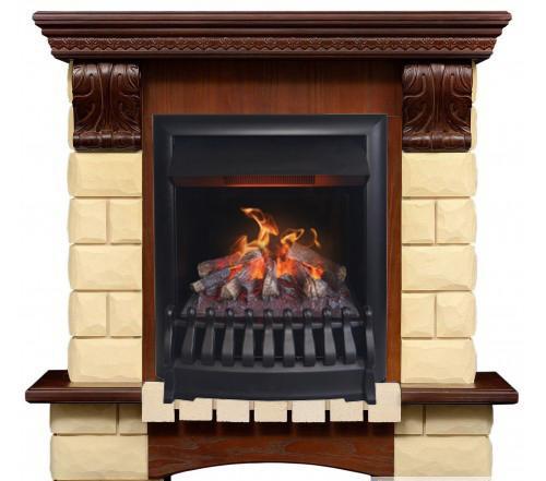 Очаг, используемый в данном каминокомплекте, выполнен в классическом стиле, что позволяет ему отлично вписаться в общий дизайн изделия. Черный цвет его корпуса создает неплохой контраст белому камню. Довершает общий декоративный вид вставка, выполненная в виде аккуратно сложенных дров.