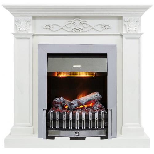 Каминокомплект «Verona» с очагом «Danville Chrome» от производителя Dimplex поможет создать в помещении островок романтического спокойствия. Этому способствует классический дизайн изделия и светлая расцветка портала. Размеры портала небольшие, что в сочетании с цветом позволяет осуществлять установку камина в небольших по площади помещениях. Дизайн изделия классический, а верхнюю панель украшает резной декоративный узор. Он отлично сочетается с декоративными розетками, расположенными в верхней части импровизированных колонн. Сверху портал оформлен массивной ступенчатой крышкой.